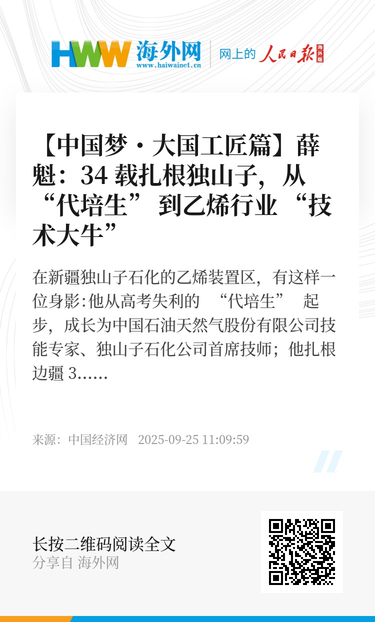 在新疆独山子石化的乙烯装置区,有这样一位身影:他从高考失利的 “代培生” 起步,成长为中国石油天然气股份有限公司技能专家、独山子石化公司首席技师;他扎根边疆 34 载,见证并参与了新疆乙烯工业从无到有、从弱到强的跨越式发展;他用精湛技艺攻克无数生产难题,用倾囊相授培育大批技能人才。他,就是乙烯行业的技术 “大牛”—— 薛魁。近日,我们走近这位 “大国工匠”,听他讲述与乙烯为伴的岁月里,关于初心、攻坚、创新与传承的故事。