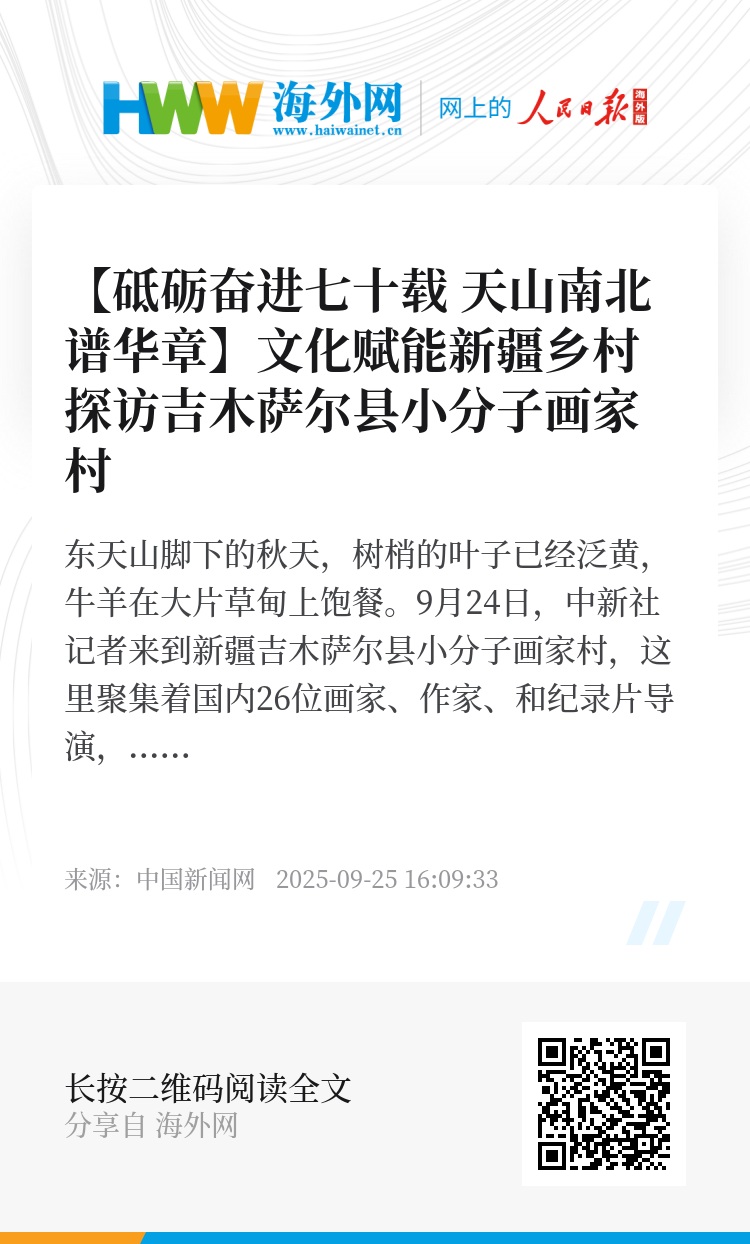 东天山脚下的秋天,树梢的叶子已经泛黄,牛羊在大片草甸上饱餐。9月24日,中新社记者来到新疆吉木萨尔县小分子画家村,这里聚集着国内26位画家、作家、和纪录片导演,成为新疆乡村振兴的一个具象缩影。