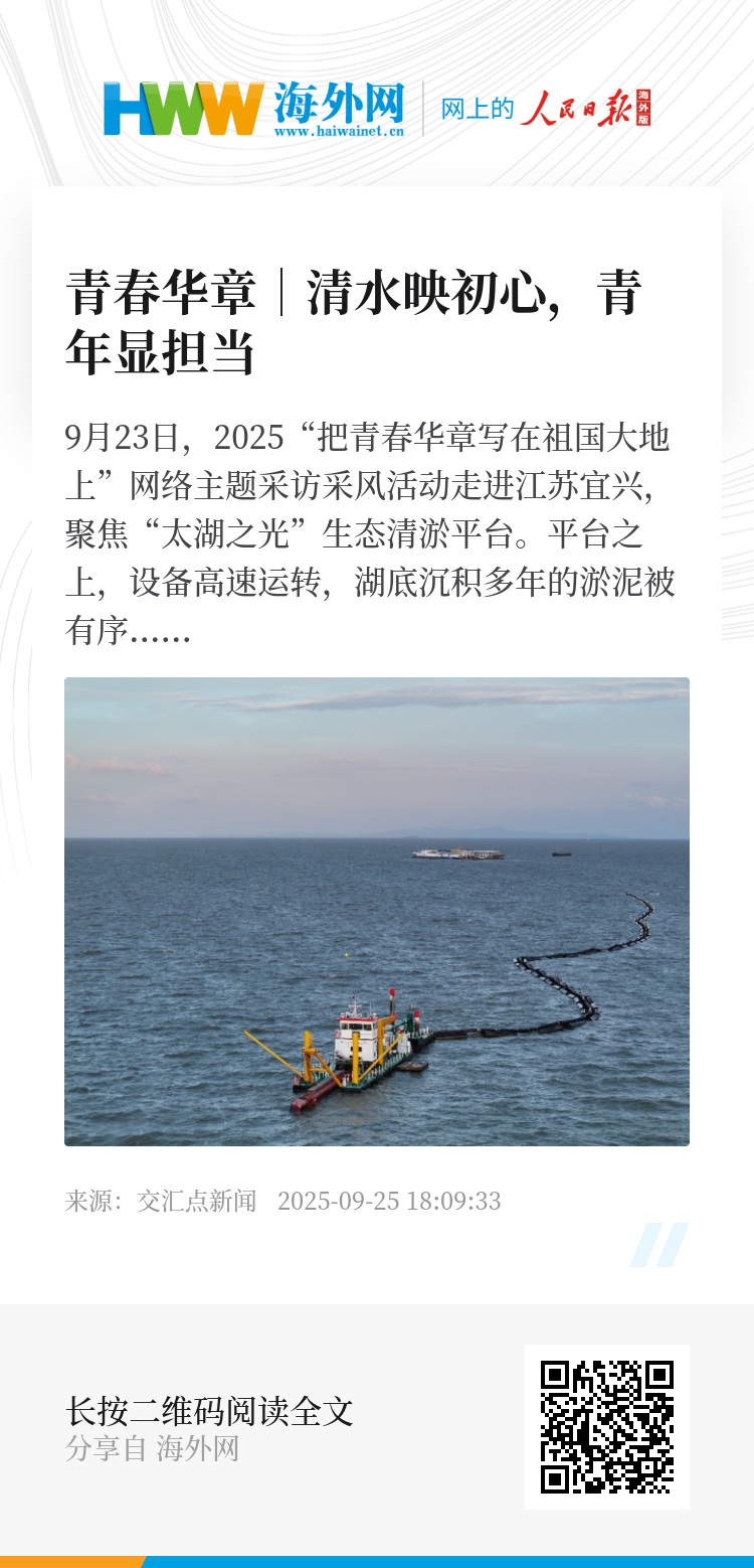 9月23日,2025“把青春华章写在祖国大地上”网络主题采访采风活动走进江苏宜兴,聚焦“太湖之光”生态清淤平台。平台之上,设备高速运转,湖底沉积多年的淤泥被有序抽排、压滤成饼,余水就地净化,达标回排。平台之下,是一群青年工程师、技术员、管理者的坚守与奋斗。他们日复一日、一丝不苟,把青春写在湖面上,也写进祖国的绿色版图里。