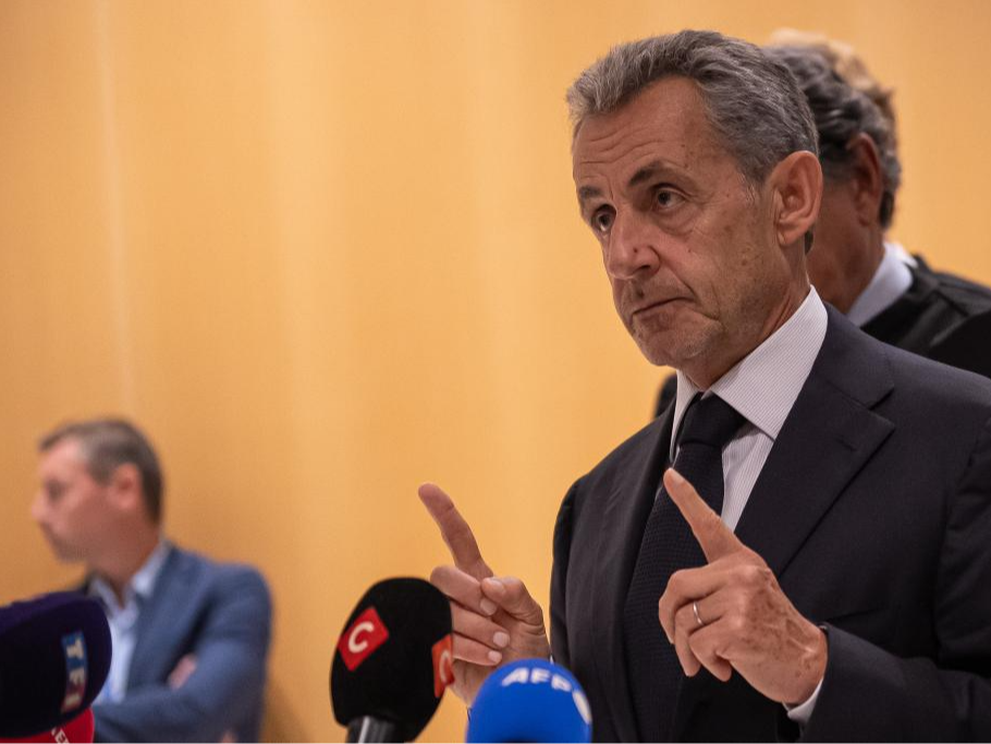9月25日,在法国巴黎,法国前总统萨科齐在庭审后接受媒体采访。新华社发(奥雷利安·莫里萨尔摄)