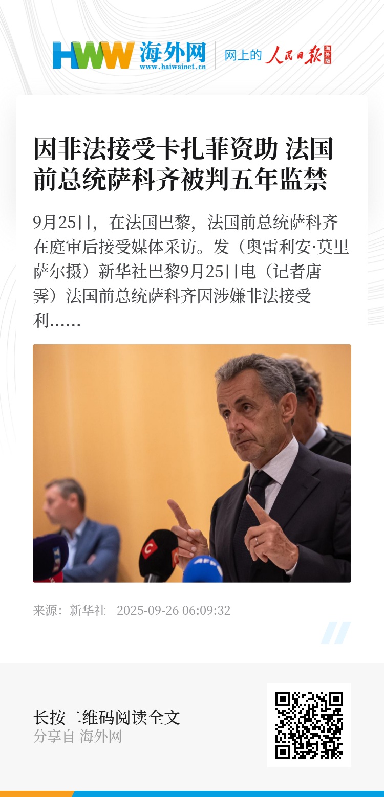 新华社巴黎9月25日电(记者唐霁)法国前总统萨科齐因涉嫌非法接受利比亚前领导人卡扎菲提供的竞选资助,25日被巴黎刑事法庭判处五年监禁。