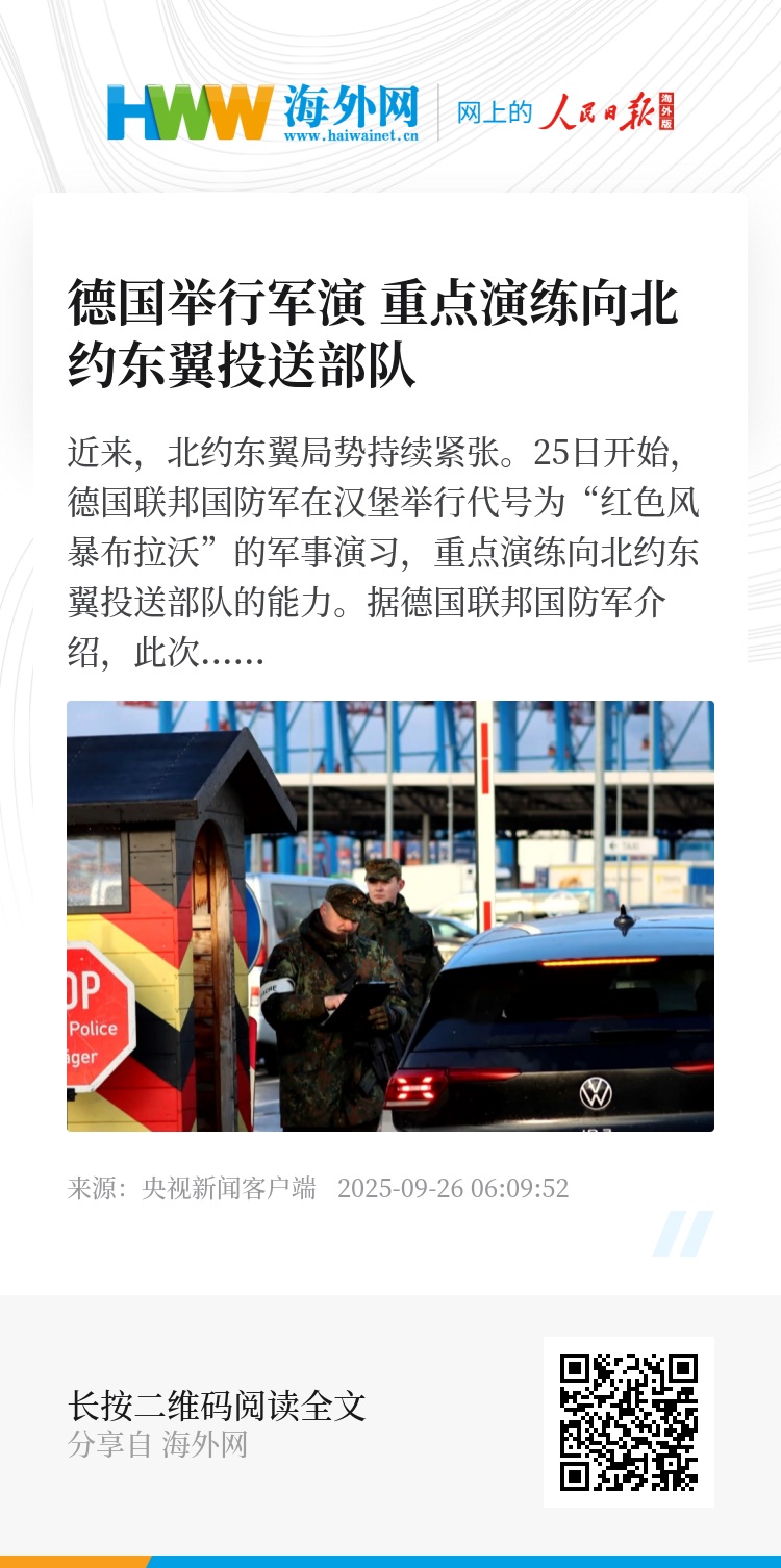 近来,北约东翼局势持续紧张。25日开始,德国联邦国防军在汉堡举行代号为“红色风暴布拉沃”的军事演习,重点演练向北约东翼投送部队的能力。