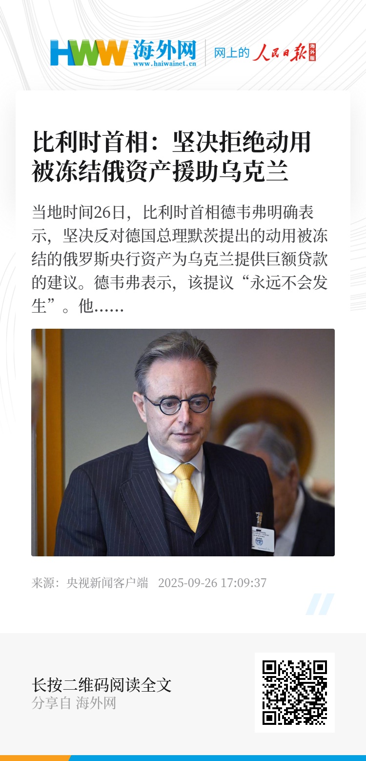 当地时间26日,比利时首相德韦弗明确表示,坚决反对德国总理默茨提出的动用被冻结的俄罗斯央行资产为乌克兰提供巨额贷款的建议。德韦弗表示,该提议“永远不会发生”。他说,拿俄罗斯的钱,把风险留给比利时,这绝不会发生。