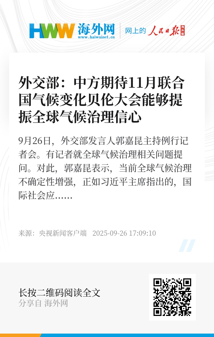 9月26日,外交部发言人郭嘉昆主持例行记者会。有记者就全球气候治理相关问题提问。