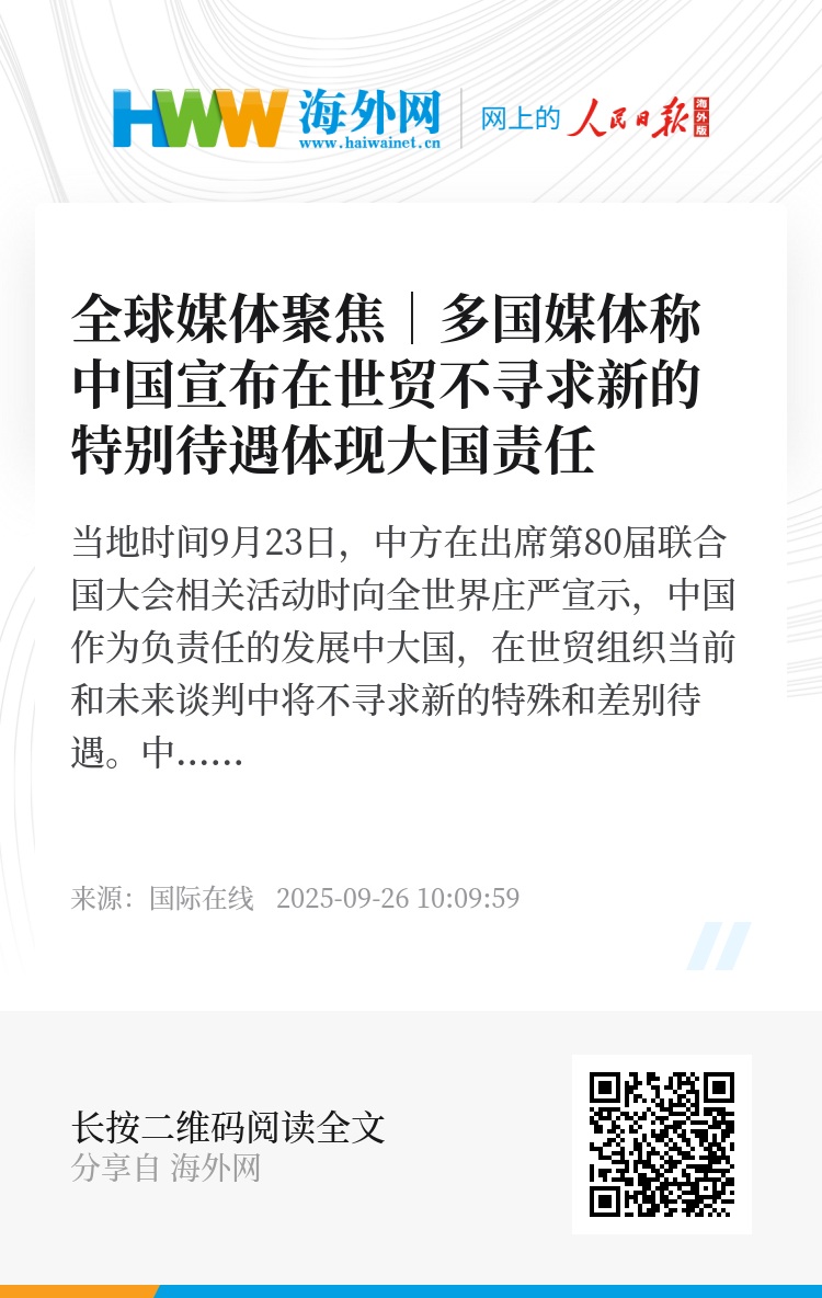 当地时间9月23日,中方在出席第80届联合国大会相关活动时向全世界庄严宣示,中国作为负责任的发展中大国,在世贸组织当前和未来谈判中将不寻求新的特殊和差别待遇。中方的这一决定,引发多家外媒关注。