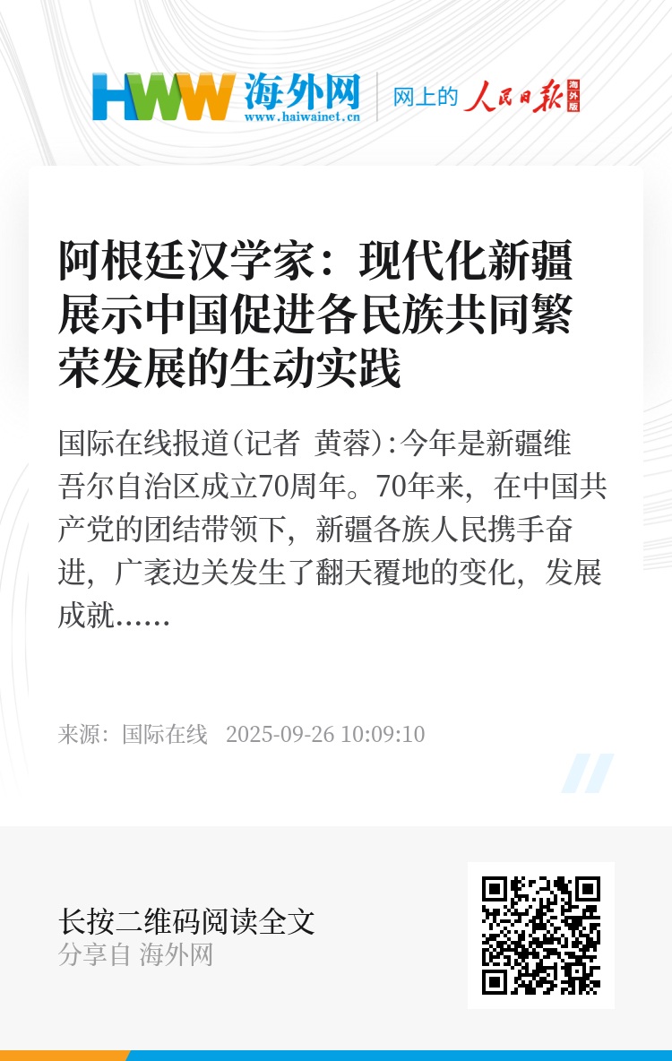 国际在线报道(记者 黄蓉):今年是新疆维吾尔自治区成立70周年。70年来,在中国共产党的团结带领下,新疆各族人民携手奋进,广袤边关发生了翻天覆地的变化,发展成就举世瞩目。阿根廷《当代》杂志创始人、汉学家伍志伟在接受国际在线专访时表示,他对新疆文旅产业的快速发展尤为关注。他认为,新疆经济的腾飞得益于中国政府对其系统性的战略谋划和大力支持,得益于中国政府重视推动民族团结进步、促进各民族共同繁荣发展的理念。