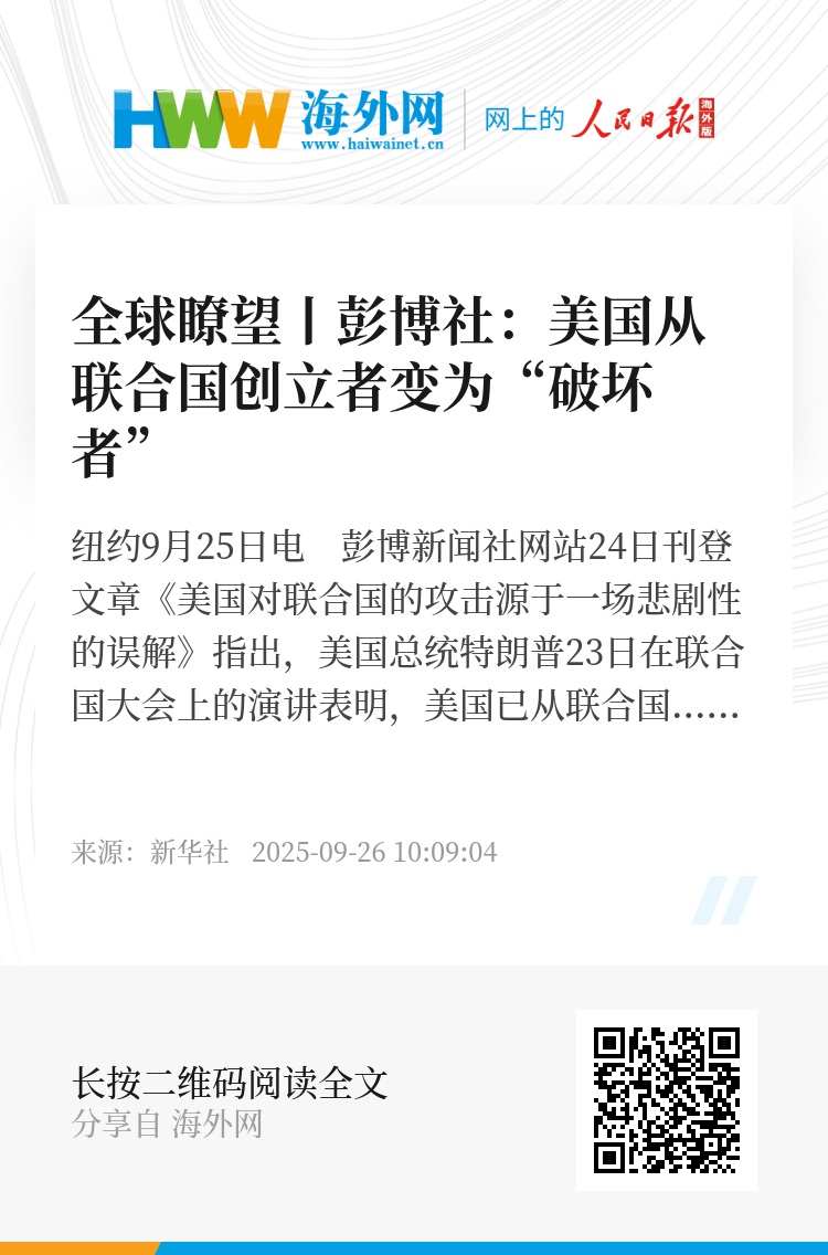 新华社纽约9月25日电 彭博新闻社网站24日刊登文章《美国对联合国的攻击源于一场悲剧性的误解》指出,美国总统特朗普23日在联合国大会上的演讲表明,美国已从联合国的共同创立者变成“破坏者”。文章摘要如下: