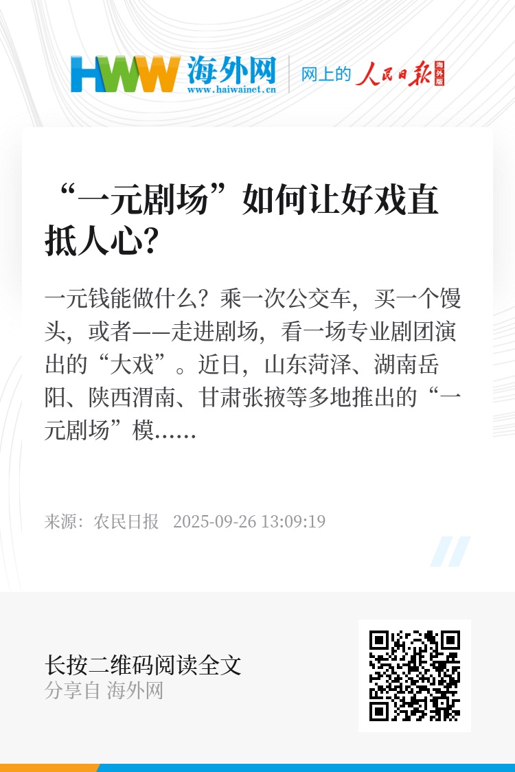 我们期待,随着“一元剧场”模式日益成熟,更多数字传播、文旅融合等创新做法的不断涌现,将会推动优质文艺资源持续下沉,让更多城乡居民享受到丰富、普惠、高质量的文化服务。
