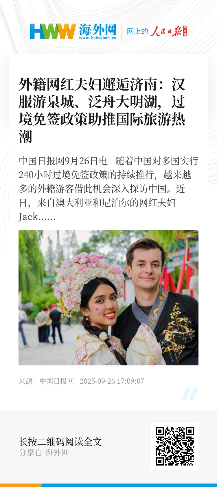中国日报网9月26日电 随着中国对多国实行240小时过境免签政策的持续推行,越来越多的外籍游客借此机会深入探访中国。近日,来自澳大利亚和尼泊尔的网红夫妇Jack和Sophia跟随着“东游记Journey to the East”的脚步来到山东济南,体验这座以“泉城”闻名的人文古城。