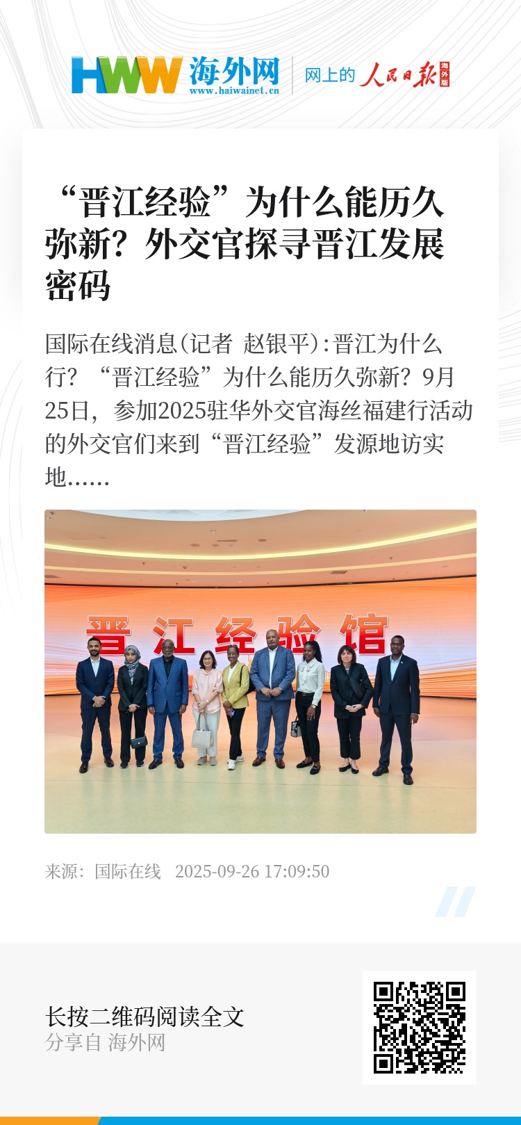 国际在线消息(记者 赵银平):晋江为什么行?“晋江经验”为什么能历久弥新?9月25日,参加2025驻华外交官海丝福建行活动的外交官们来到“晋江经验”发源地访实地、走企业、找答案。