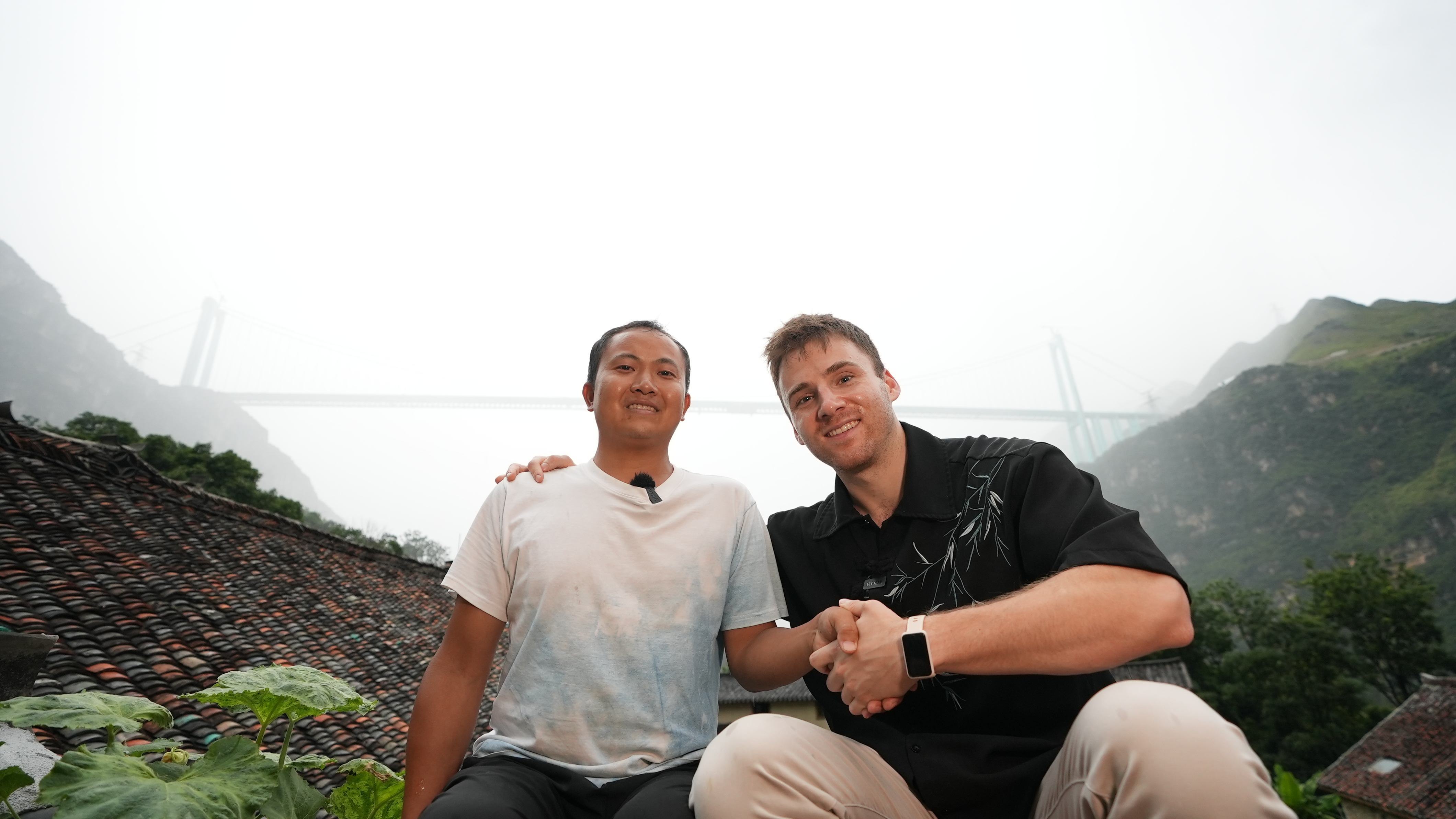 林国权(左)与柯鲁瀚(右)在民宿屋顶与花江峡谷大桥合影留念。贵州日报天眼新闻记者 郭加尧 摄