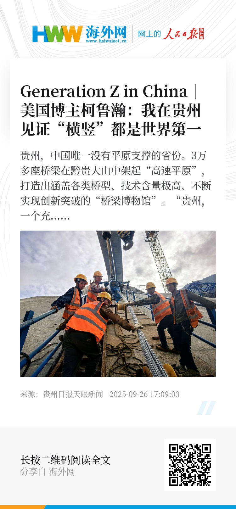 连接天际,更连接人心。在“横竖都是世界第一”背后,柯鲁瀚见证了工程奇观,感受到“贵州实力”,更理解了“万桥飞架”连接的未来。