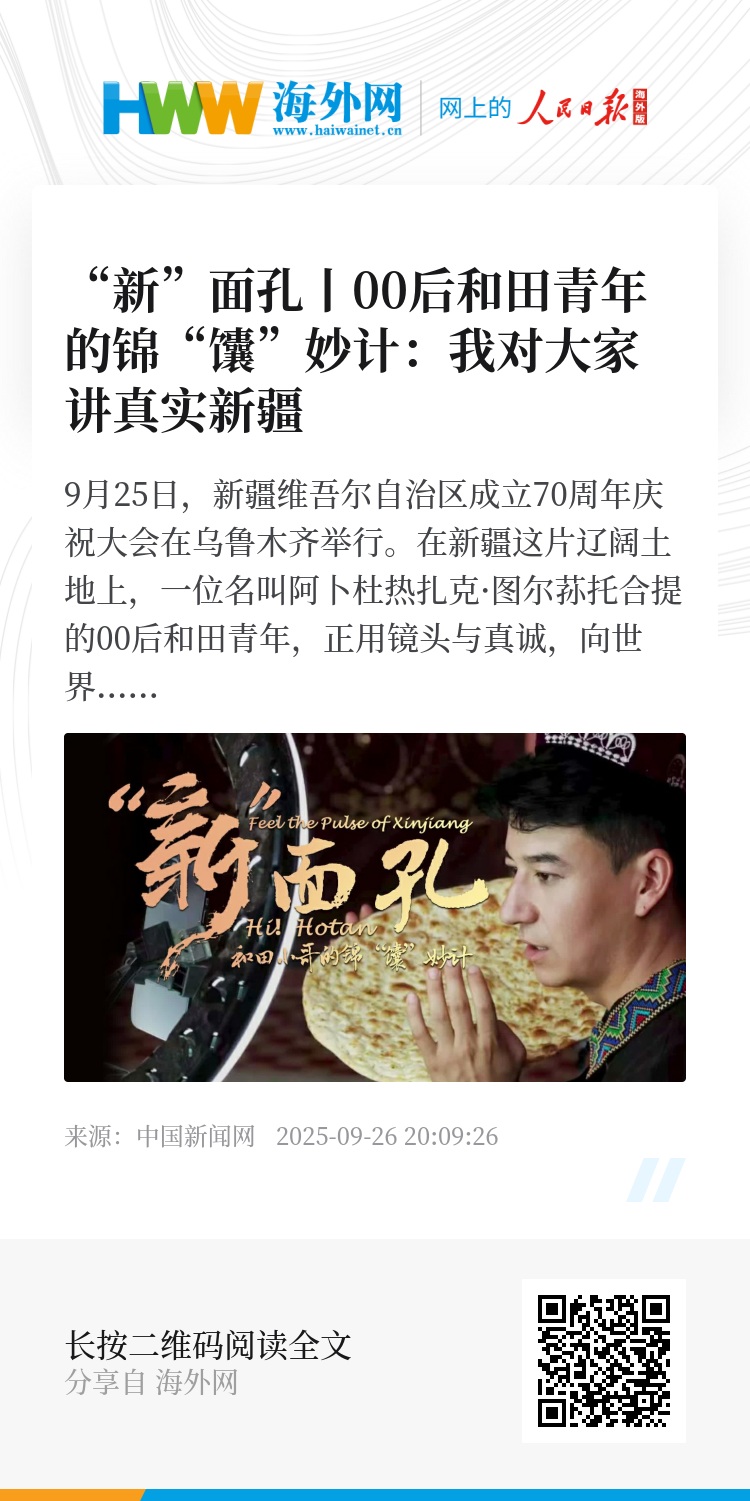 9月25日,新疆维吾尔自治区成立70周年庆祝大会在乌鲁木齐举行。在新疆这片辽阔土地上,一位名叫阿卜杜热扎克·图尔荪托合提的00后和田青年,正用镜头与真诚,向世界讲述着一个真实、鲜活、充满希望的新疆。