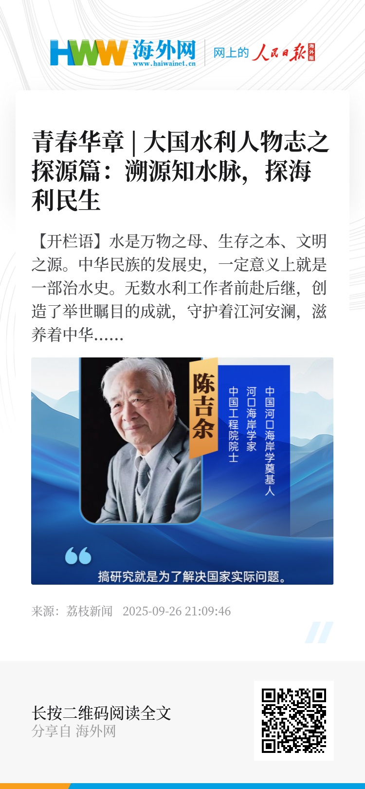 陈吉余,我国河口海岸学奠基人。1952年,毕业于浙江大学史地系的他来到华东师范大学教书,同时开拓研究项目。他创建了我国第一个河口海岸研究机构,开拓了以动力、沉积、地貌相结合为特色的河口海岸学科体系。几十年的科研历程中,他始终身体力行,在河口治理、海岸工程、围海工程等方面取得了重要成果,解决了许多工程建设中的实际问题。“浦东机场的外移和九段沙引鸟”为国家节省了3.6亿元投资和大量土地,“长江河口建设青草沙江心水库”为上海市解决水源开辟了新途径。2017年,陈吉余逝世,享年97岁。