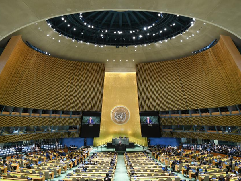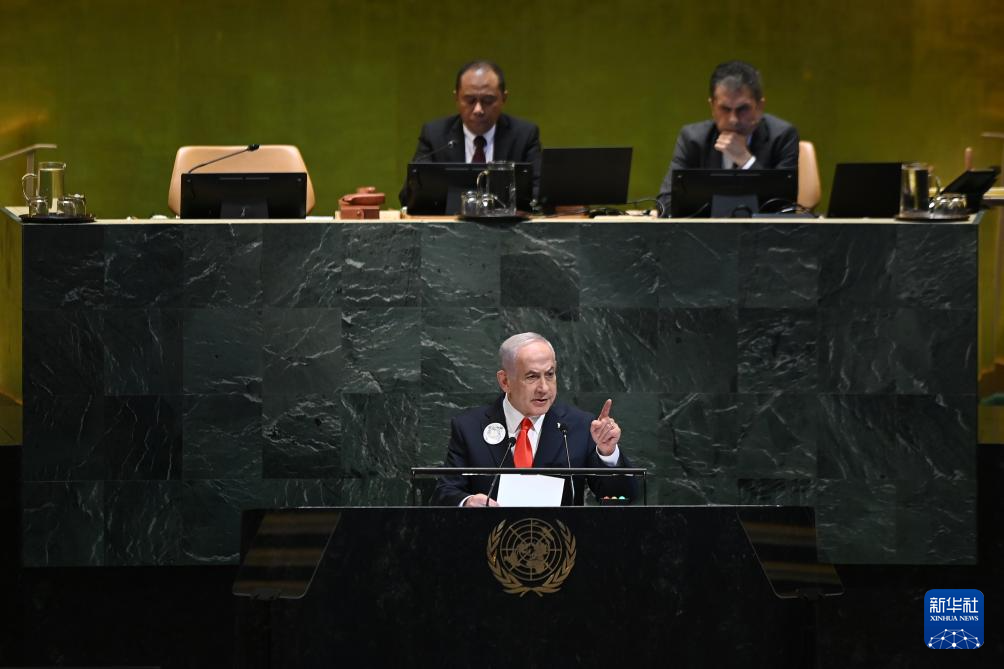 9月26日,在位于纽约的联合国总部,以色列总理内塔尼亚胡在第80届联合国大会一般性辩论发言。众多联合国会员国代表起身离席,退场抗议。新华社记者李睿摄