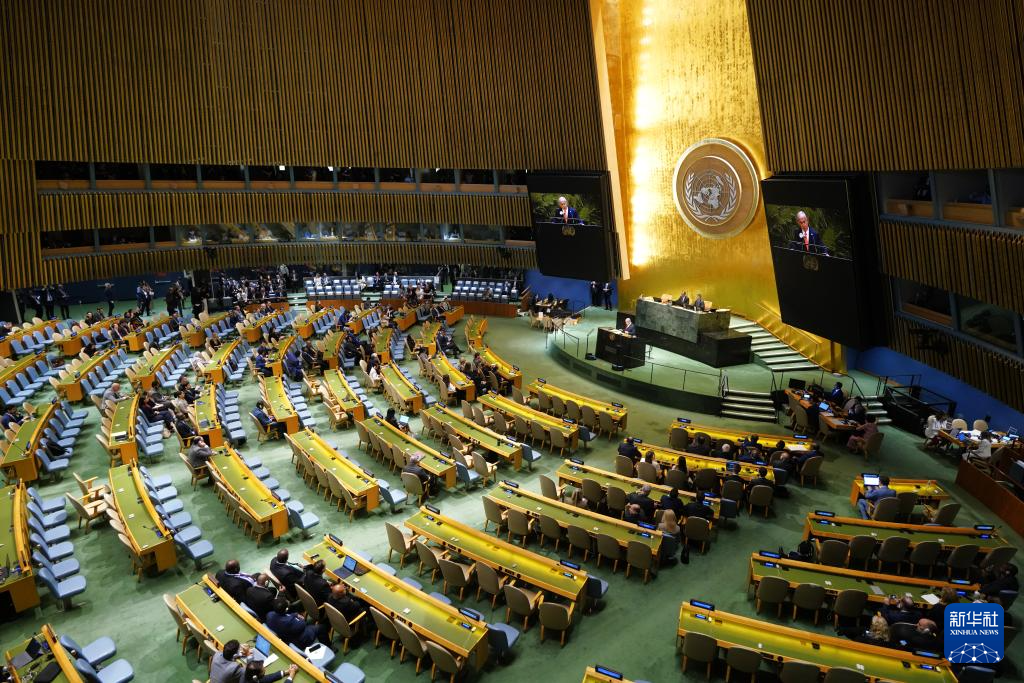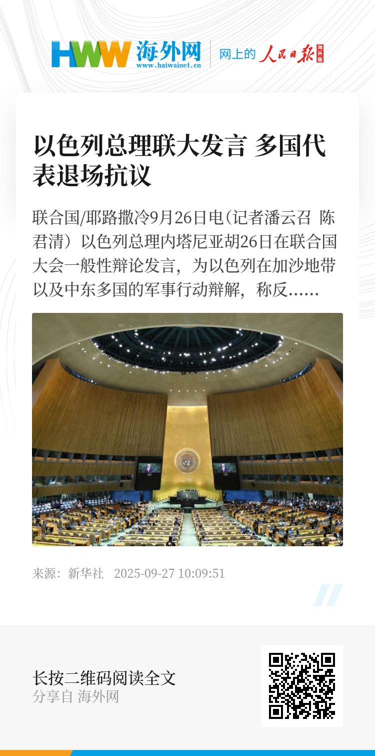 9月26日,在位于纽约的联合国总部,以色列总理内塔尼亚胡在第80届联合国大会一般性辩论发言。众多联合国会员国代表起身离席,退场抗议。新华社记者吴晓凌摄