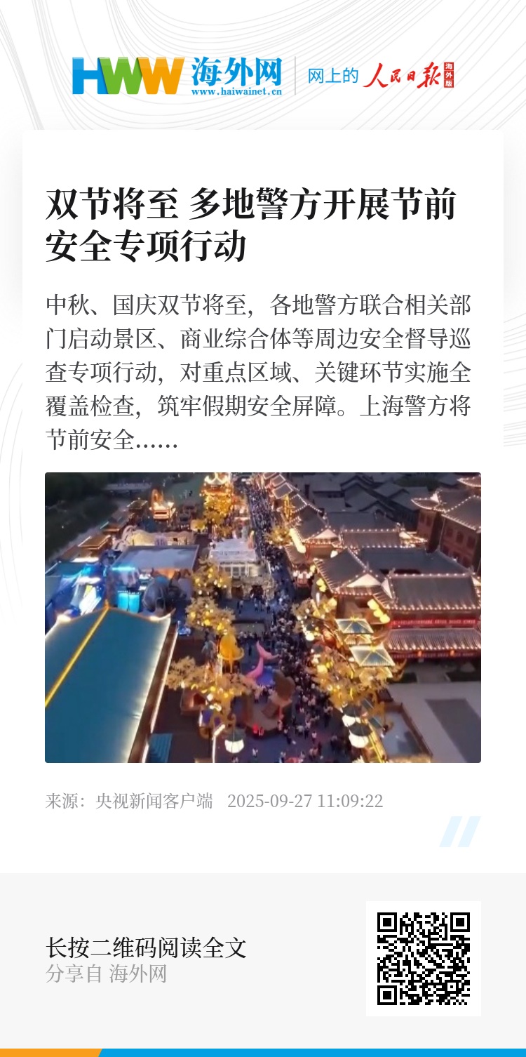 中秋、国庆双节将至,各地警方联合相关部门启动景区、商业综合体等周边安全督导巡查专项行动,对重点区域、关键环节实施全覆盖检查,筑牢假期安全屏障。