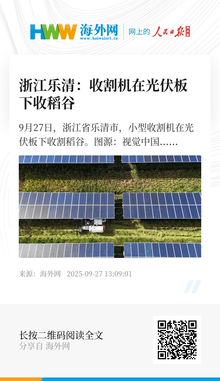 32897318,.浙江乐清:收割机在光伏板下收稻谷,.2025-09-27 13:52:01,.204589,.黄之安、卢思宇
