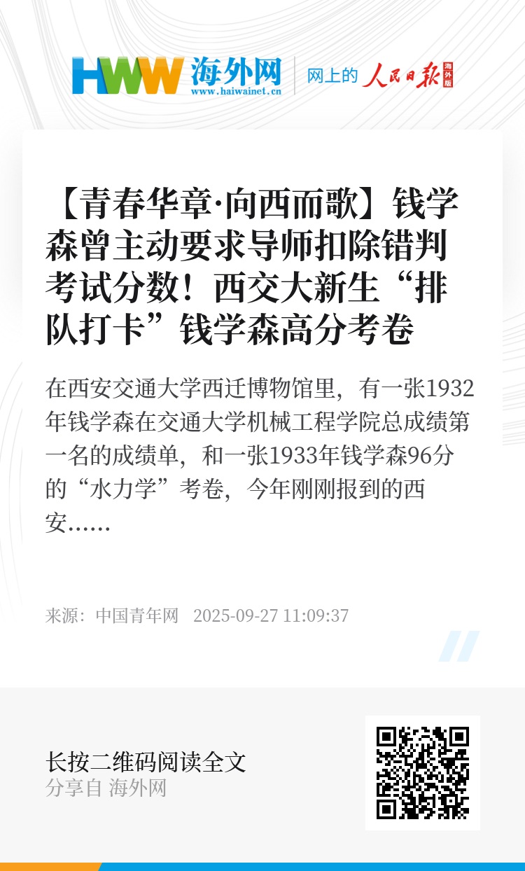 在西安交通大学西迁博物馆里,有一张1932年钱学森在交通大学机械工程学院总成绩第一名的成绩单,和一张1933年钱学森96分的“水力学”考卷,今年刚刚报到的西安交通大学大一新生们在参观博物馆时纷纷来此打卡。“钱学森曾在公式推导时因漏写一个‘S’被扣掉4分,在导师未发现的情况下主动向其承认错误并要求扣除相应分数,可见钱学森前辈之严谨、优秀”,一名来自西安交通大学人工智能学院的大一新生感叹。