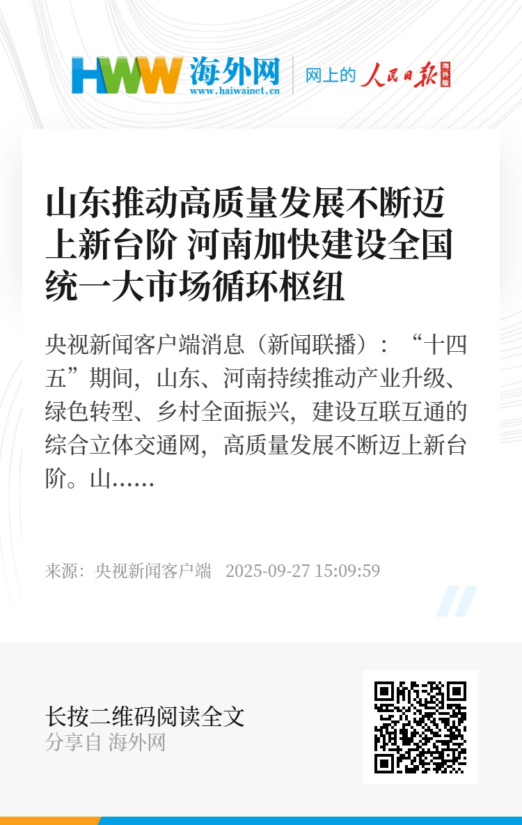 央视新闻客户端消息(新闻联播):“十四五”期间,山东、河南持续推动产业升级、绿色转型、乡村全面振兴,建设互联互通的综合立体交通网,高质量发展不断迈上新台阶。