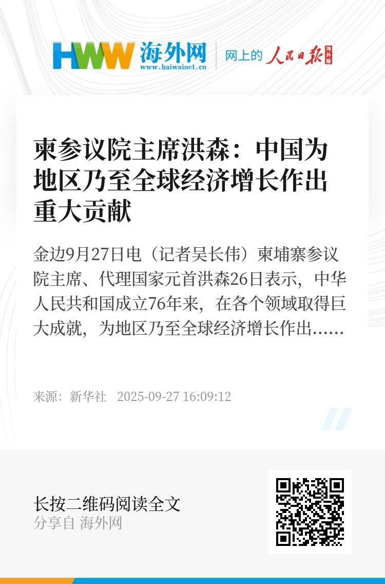 新华社金边9月27日电(记者吴长伟)柬埔寨参议院主席、代理国家元首洪森26日表示,中华人民共和国成立76年来,在各个领域取得巨大成就,为地区乃至全球经济增长作出重大贡献。