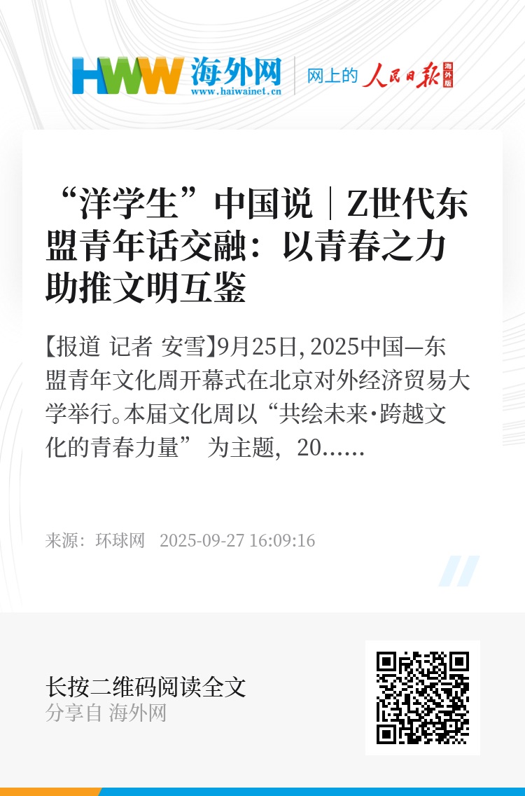 【环球网报道 记者 安雪】9月25日,2025中国—东盟青年文化周开幕式在北京对外经济贸易大学举行。本届文化周以 “共绘未来・跨越文化的青春力量” 为主题,200余位中国—东盟领域有关专家及青年代表参会。开幕式共设 “初绽・万花共生”“同生・山水和鸣”“交辉・千里同心”“共绘・和合致远” 四个篇章,名称兼具诗意与文化内涵。东盟Z世代留学生对这四个篇章有着怎样的理解?又如何看待中国—东盟国家之间的文化联结与文明互鉴?