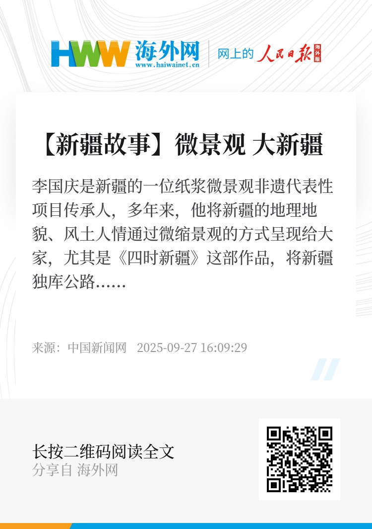 李国庆是新疆的一位纸浆微景观非遗代表性项目传承人,多年来,他将新疆的地理地貌、风土人情通过微缩景观的方式呈现给大家,尤其是《四时新疆》这部作品,将新疆独库公路的四季景色与地理形态融为一体,充分展现了新疆的大美景色,未来他希望能够创作出更多新疆历史人文类的作品,让更多人通过他的作品认识新疆、了解新疆。