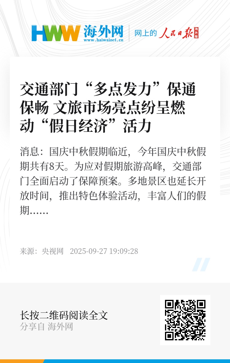 央视网消息:国庆中秋假期临近,今年国庆中秋假期共有8天。为应对假期旅游高峰,交通部门全面启动了保障预案。多地景区也延长开放时间,推出特色体验活动,丰富人们的假期体验。
