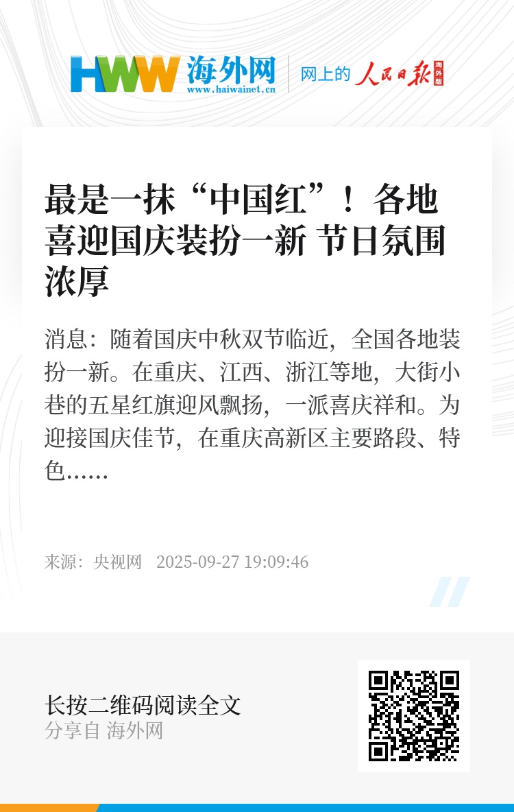 央视网消息:随着国庆中秋双节临近,全国各地装扮一新。在重庆、江西、浙江等地,大街小巷的五星红旗迎风飘扬,一派喜庆祥和。