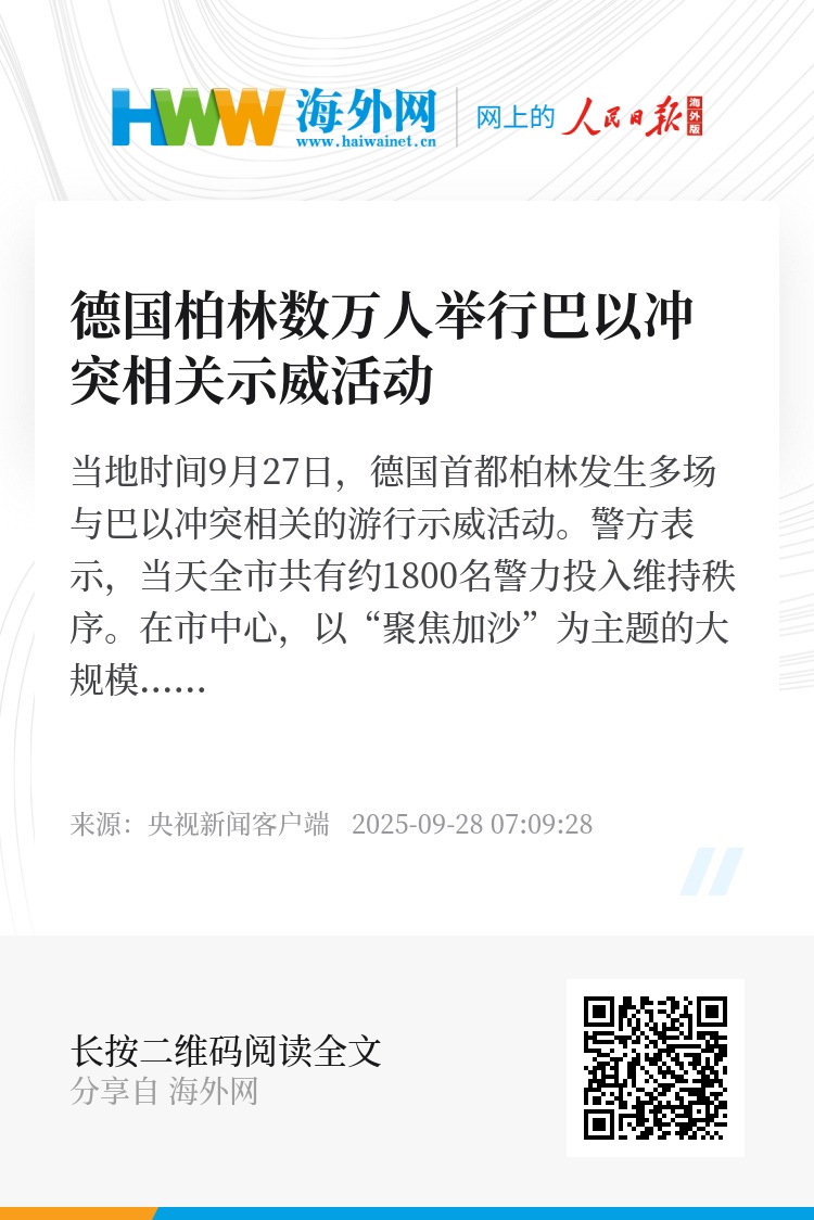 据悉,当晚在胜利纪念柱附近还将继续举行名为“聚焦加沙——停止种族灭绝”的声援集会,计划持续至22时,除政治发言外,还将包括音乐表演。(总台记者 阮佳闻)