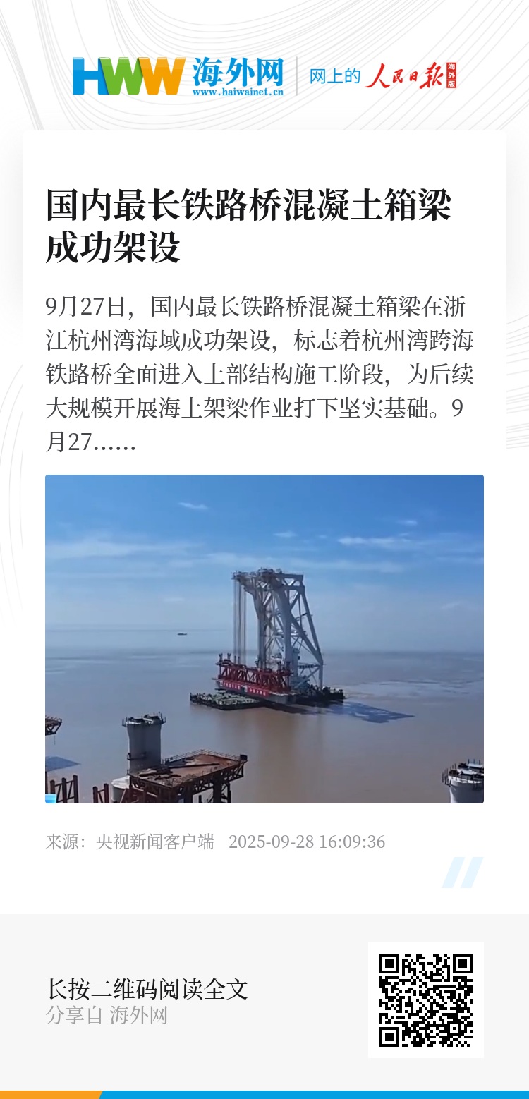 9月27日,国内最长铁路桥混凝土箱梁在浙江杭州湾海域成功架设,标志着杭州湾跨海铁路桥全面进入上部结构施工阶段,为后续大规模开展海上架梁作业打下坚实基础。