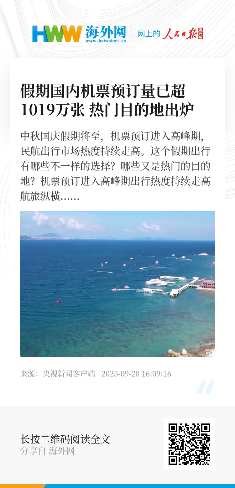 航旅纵横大数据显示,截至9月26日,2025年国庆中秋假期国内航线机票预订量已突破1019万张,日均预订量较去年同期增长约6%。