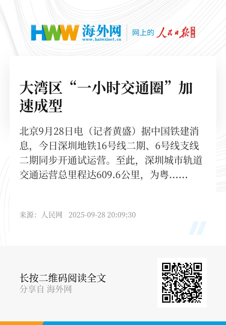 人民网北京9月28日电(记者黄盛)据中国铁建消息,今日深圳地铁16号线二期、6号线支线二期同步开通试运营。至此,深圳城市轨道交通运营总里程达609.6公里,为粤港澳大湾区“一小时交通圈”加速成型注入新动能。