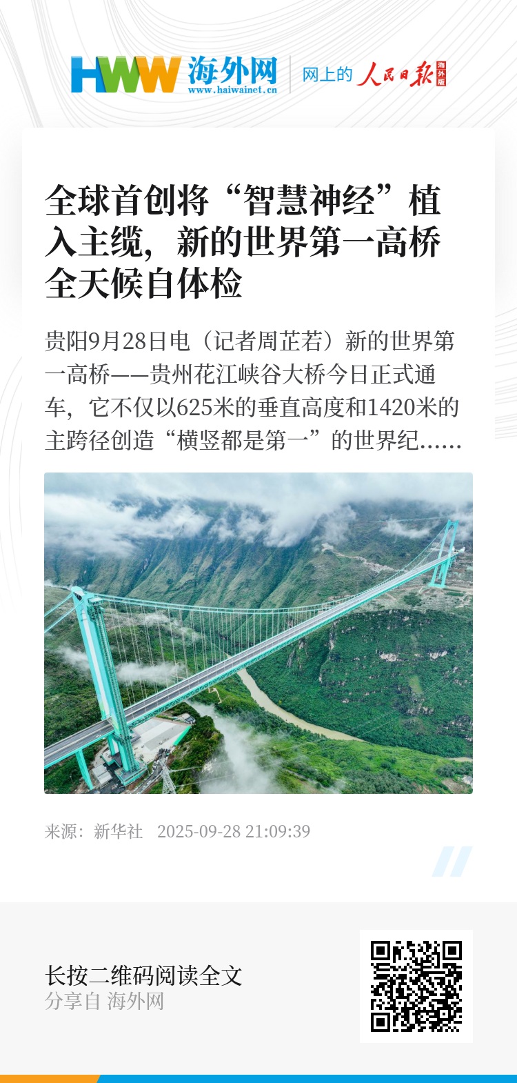 新华社贵阳9月28日电(记者周芷若)新的世界第一高桥——贵州花江峡谷大桥今日正式通车,它不仅以625米的垂直高度和1420米的主跨径创造“横竖都是第一”的世界纪录,更在全球首次为悬索桥主缆植入智慧“神经”。