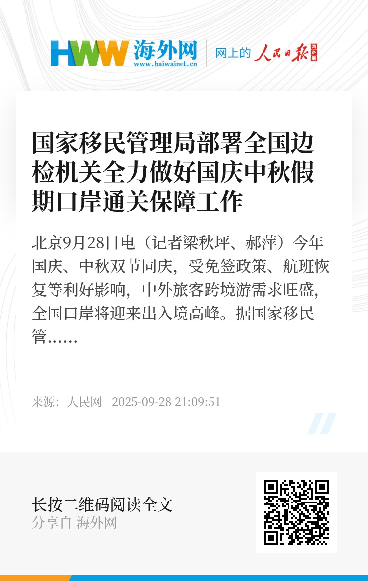 近日,国家移民管理局就做好国庆、中秋假期口岸边防检查工作作出专门部署,要求全国边检机关加强出入境流量和口岸运行情况监测,及时发布本口岸出入境客流信息,为出入境人员行程安排提供参考;加强勤务组织,配置充足警力,确保中国公民出入境通关排队不超过30分钟;密切与口岸联检单位和地方相关部门协同联动,对通关高峰期客流疏导和交通配套综合保障等作出稳妥安排,防范可能出现的强降雨等极端天气不利影响,共同确保口岸通关安全高效顺畅。