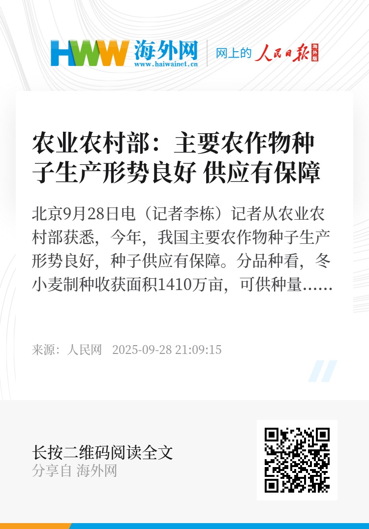 人民网北京9月28日电(记者李栋)记者从农业农村部获悉,今年,我国主要农作物种子生产形势良好,种子供应有保障。