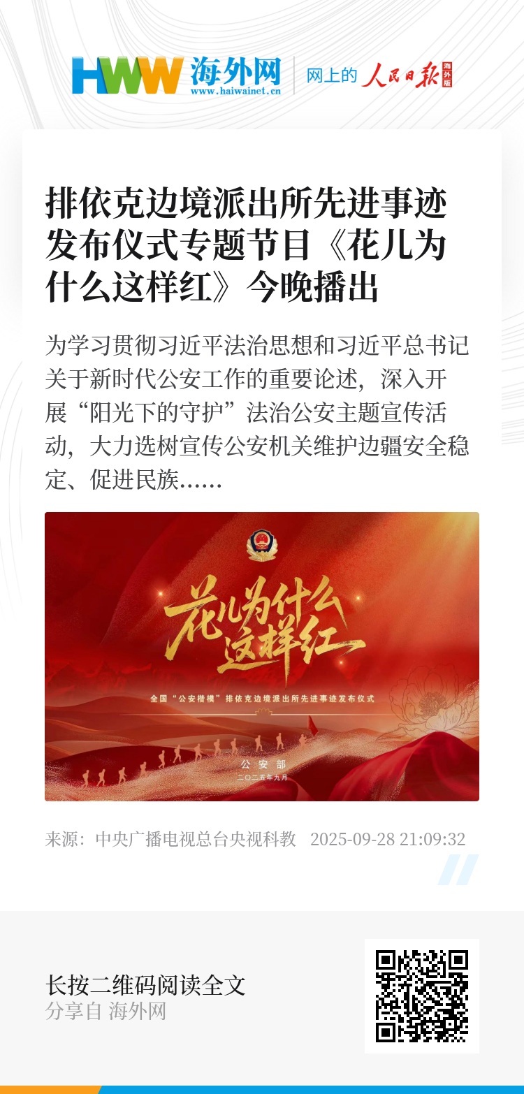 排依克边境派出所先进事迹发布仪式在新疆乌鲁木齐市举行,邀请戍边民警、各族群众、义务护边员、民警家属和媒体记者代表等走进发布厅,运用历史和现实相交织的跨时空表达方式,采取情景讲述、视频展示、艺术呈现相结合的沉浸式表现手法,分“红色基因永相传”“青春血液来浇灌”“昆仑利刃守边关”“阳光照耀帕米尔”“石榴花开排依克”“我站立的地方是中国”等版块,立体展现排依克边境派出所民警,完整准确全面贯彻新时代党的治疆方略,铸牢中华民族共同体意识,传承红色基因、赓续戍边使命,“扎根帕米尔、忠诚守边关”的崇高精神和感人事迹,大力弘扬公安机关优良传统和社会主义法治文化。