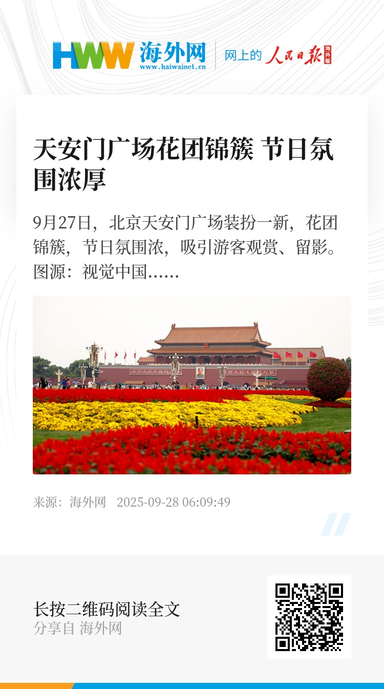 9月27日,北京天安门广场装扮一新,花团锦簇,节日氛围浓,吸引游客观赏、留影。图源:视觉中国