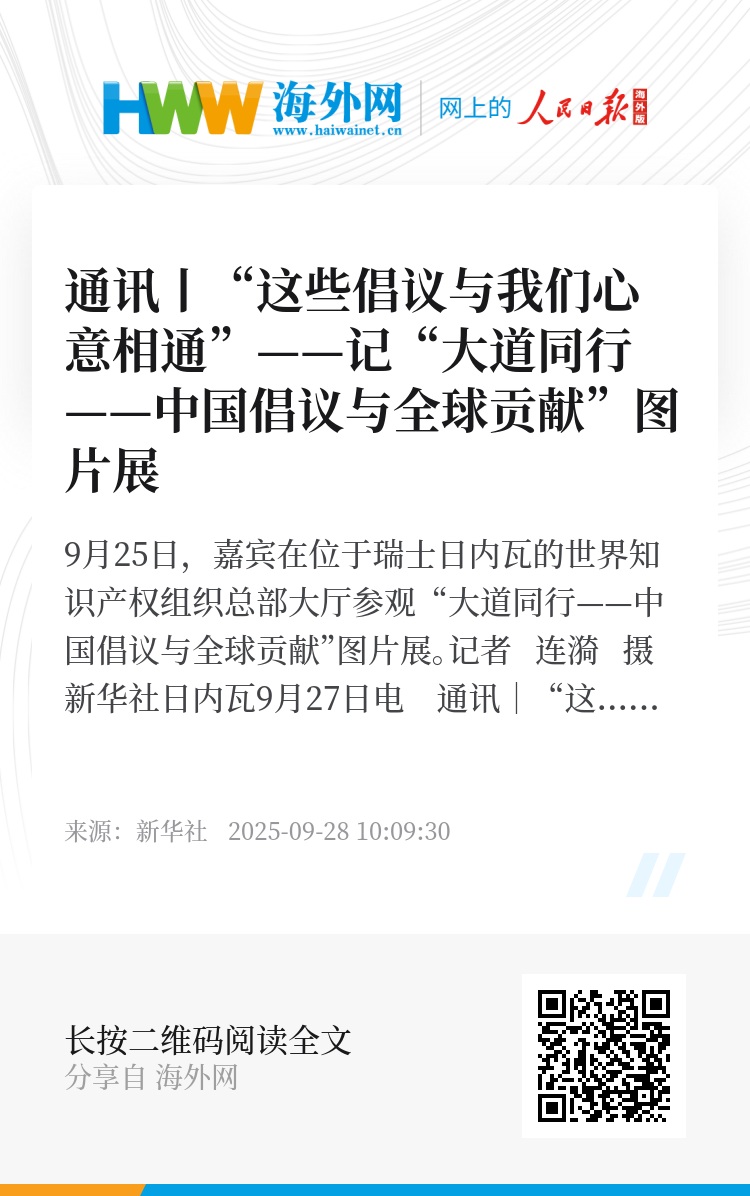 新华社日内瓦9月27日电 通讯|“这些倡议与我们心意相通”——记“大道同行——中国倡议与全球贡献”图片展
