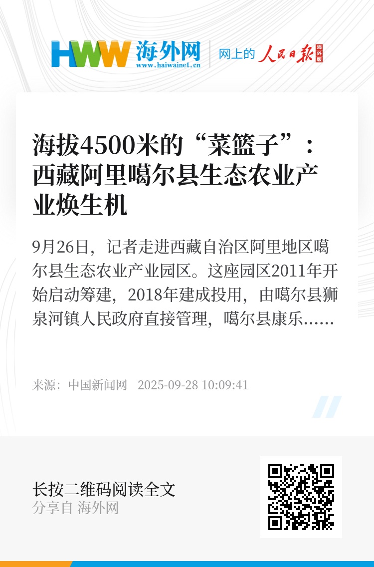 9月26日,记者走进西藏自治区阿里地区噶尔县生态农业产业园区。这座园区2011年开始启动筹建,2018年建成投用,由噶尔县狮泉河镇人民政府直接管理,噶尔县康乐新居综合专业合作社具体经营。为破解群众“吃菜贵、品种少、搬迁户就业难”的突出问题,园区打造了集蔬菜林果种植、畜禽养殖及综合利用为一体的设施农业基地。其占地面积1000亩,设有日光温室172座、五膜拱棚26座、智能联动温室16座、畜禽圈舍4座、冷库4座,目前种植蔬菜、水果、花卉400余亩,培育苗木250亩。2022年12月被评为西藏自治区级农业科技园。(贡确 制作 乐小敏)