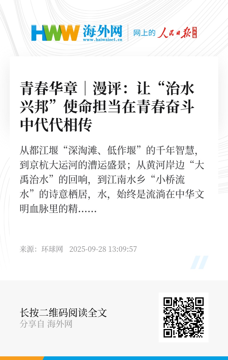 从过去、当下到未来,青年始终是时代的见证者、参与者和开创者。当代青年应学水之“韧”,像浪花那样面对礁石险滩不退缩,在攻克技术难关、应对挑战时,以“水滴石穿”的毅力啃下硬骨头;学水之“活”,用创新思维为传统水利注入科技活力,让智慧监测、数字治水成为应对难题的“新武器”;学水之“善”,像滋养万物的春雨那样怀揣“利民为本”的初心,把治水的成效写在百姓的心坎上。当代青年要昂头挺胸,树立“护江河、安家国”的远大志向,把个人理想融入实现中华民族永续发展的蓝图中,让“碧水润华夏”的愿景代代延续,让“治水兴邦”的使命在奋斗中传承。