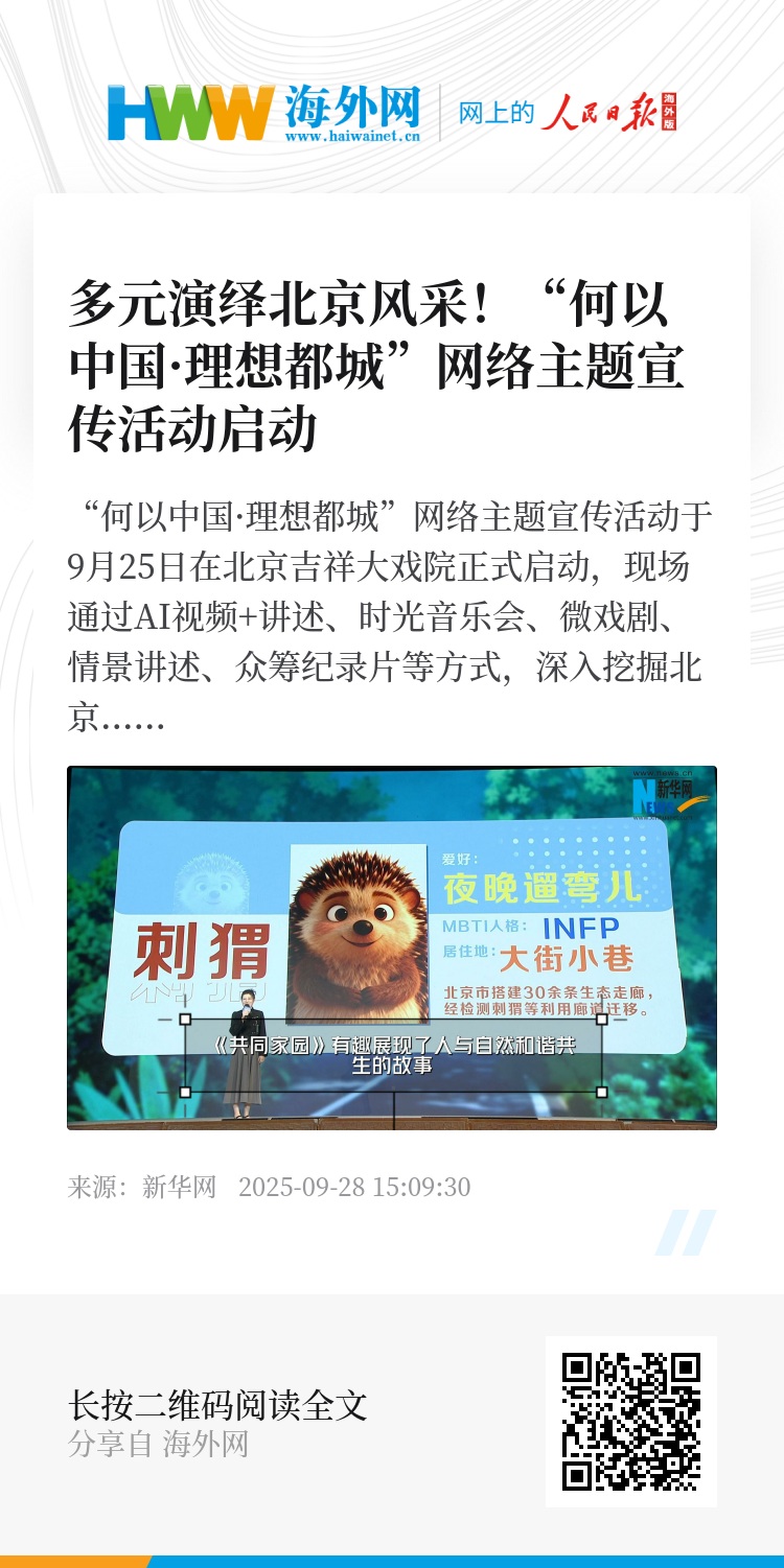 “何以中国·理想都城”网络主题宣传活动于9月25日在北京吉祥大戏院正式启动,现场通过AI视频+讲述、时光音乐会、微戏剧、情景讲述、众筹纪录片等方式,深入挖掘北京的首都风范、古都风韵和时代风貌,展现北京在高质量发展、文化建设等方面的首善之为。