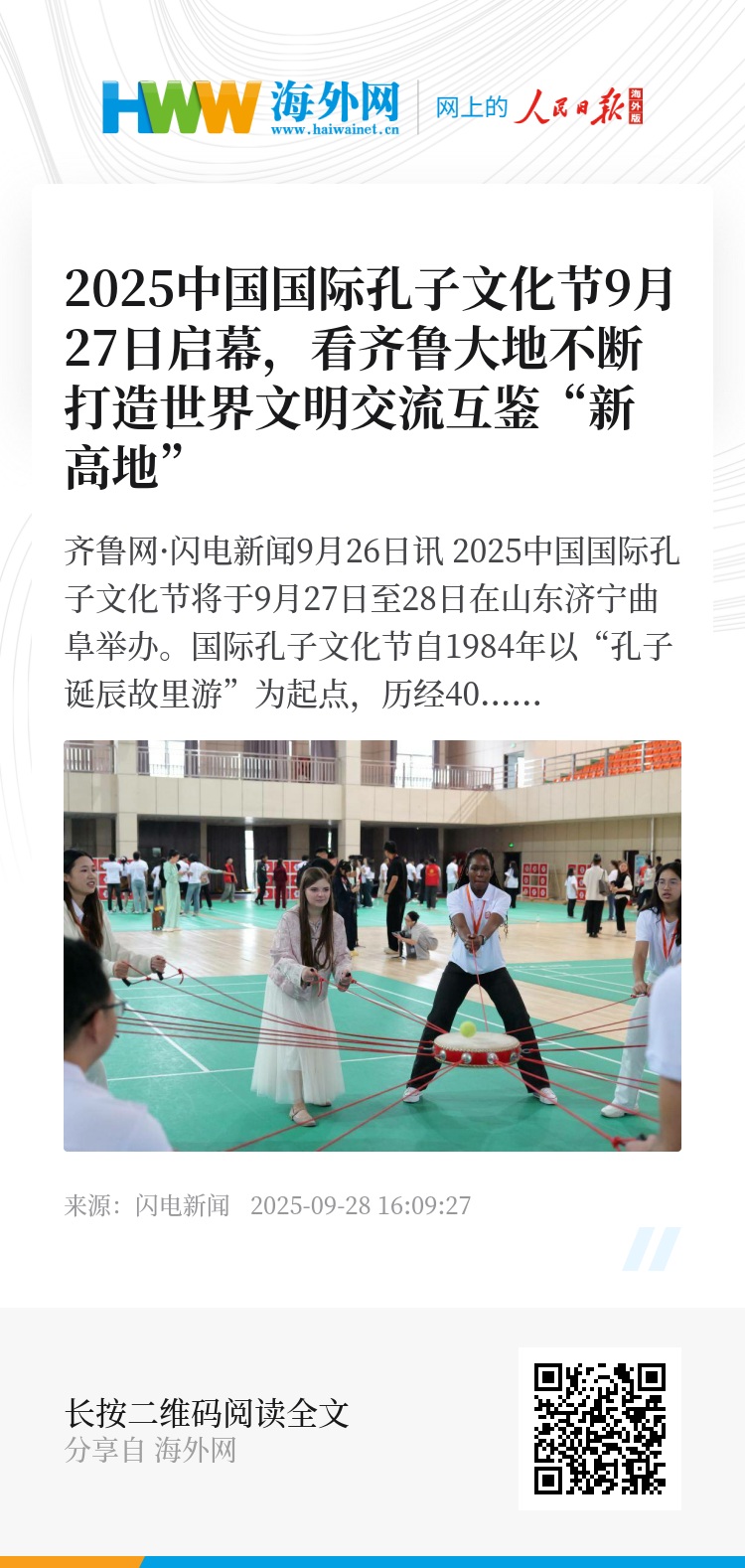 就在9月,来自23所高校的40位带队老师以及来自49个国家的134名中外青年学生齐聚文化圣城——山东济宁,走近圣人孔子,一起聆听“美美与共,和合共生”的文明交响。此外,山东还举办“与子同学·齐风共鉴”——中外学生共寻齐文化根脉活动等,邀请中外青年学生走进山东实地体验,向世界生动讲述孔子故事、中国故事。