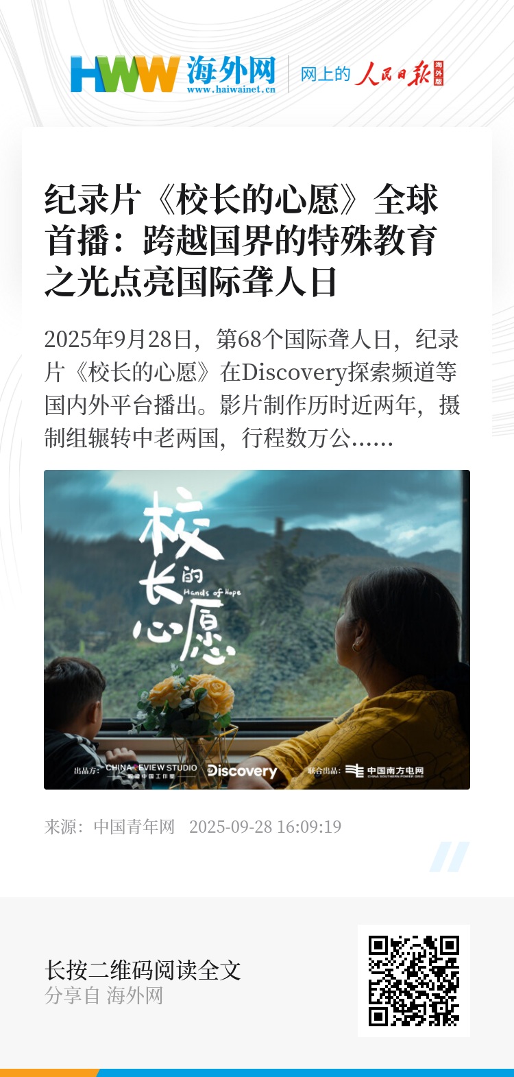 2025年9月28日,第68个国际聋人日,纪录片《校长的心愿》在Discovery探索频道等国内外平台播出。影片制作历时近两年,摄制组辗转中老两国,行程数万公里,用镜头记录下中老两国听障教育者之间跨越国界的互助友谊。