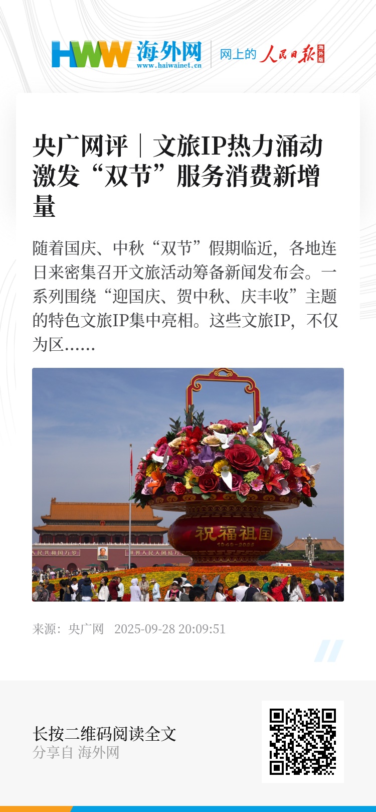 文旅IP热力涌动,背后是各地各部门对消费升级趋势的精准把握,也是对服务消费潜力的深度挖掘。随着人们的消费需求从“有没有”向“好不好”转变,优质、特色、创新的文旅IP成为撬动消费的关键变量。我们欣喜地看到,从需求侧挖掘潜能,从供给侧创新服务供给,一系列促消费行动正以精准节奏推进,激发服务消费新增量,为消费“引擎”注入新动能。(央广网评论员 文峰)