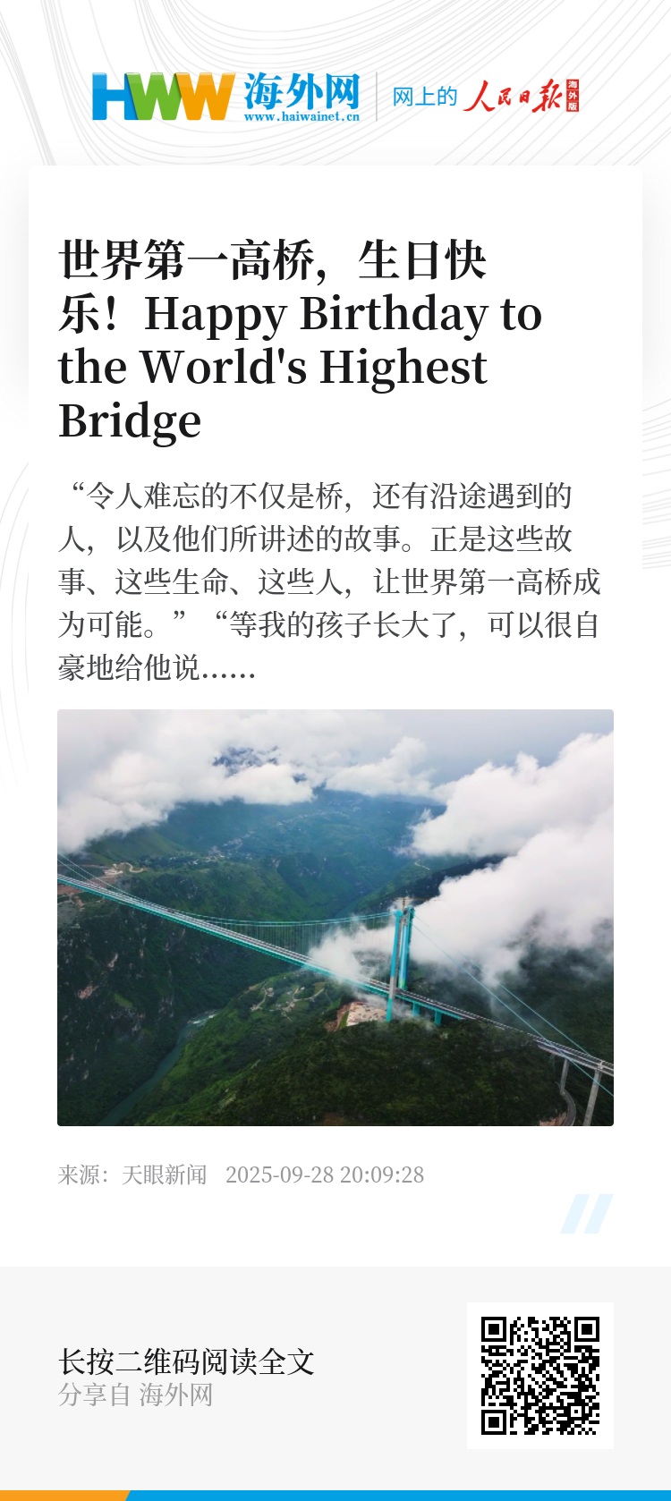“令人难忘的不仅是桥,还有沿途遇到的人,以及他们所讲述的故事。正是这些故事、这些生命、这些人,让世界第一高桥成为可能。”