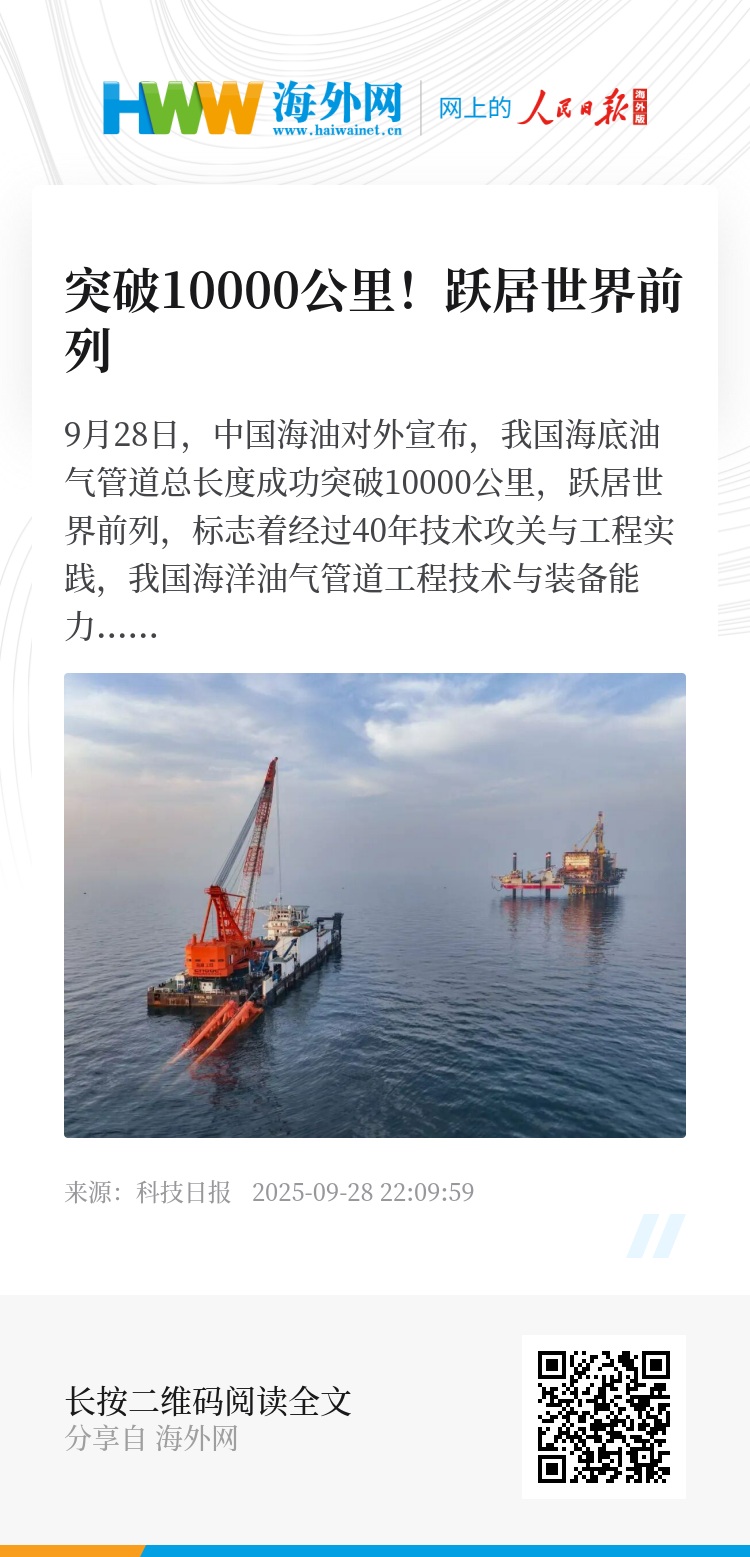 9月28日,中国海油对外宣布,我国海底油气管道总长度成功突破10000公里,跃居世界前列,标志着经过40年技术攻关与工程实践,我国海洋油气管道工程技术与装备能力实现全方位跨越,对加快海洋油气资源开发、提升国家海洋能源自主保障能力具有里程碑意义。