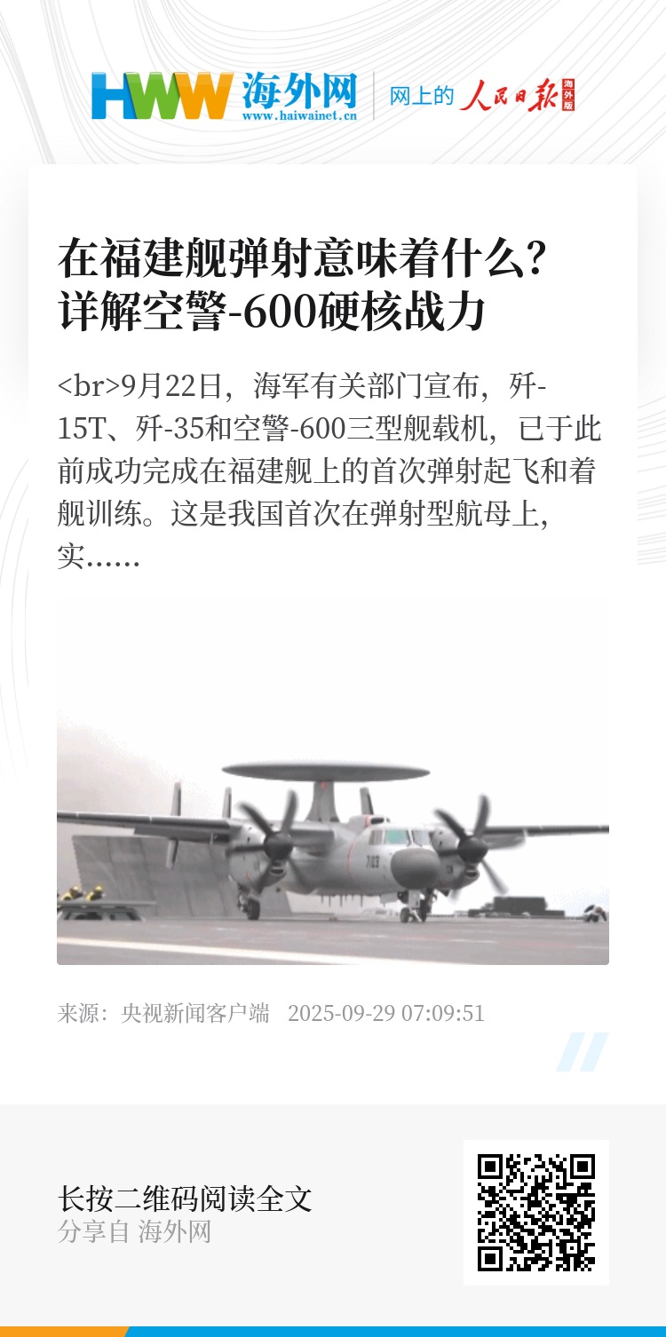 9月22日,海军有关部门宣布,歼-15T、歼-35和空警-600三型舰载机,已于此前成功完成在福建舰上的首次弹射起飞和着舰训练。这是我国首次在弹射型航母上,实现多型号先进舰载机的电磁弹射和阻拦着舰,标志着福建舰具备了电磁弹射和回收能力。
