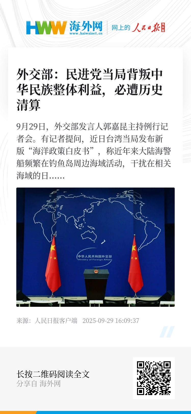 9月29日,外交部发言人郭嘉昆主持例行记者会。有记者提问,近日台湾当局发布新版“海洋政策白皮书”,称近年来大陆海警船频繁在钓鱼岛周边海域活动,干扰在相关海域的日方舰机和渔船等,借此凸显钓鱼岛主权争议。请问中方对此有何评论?