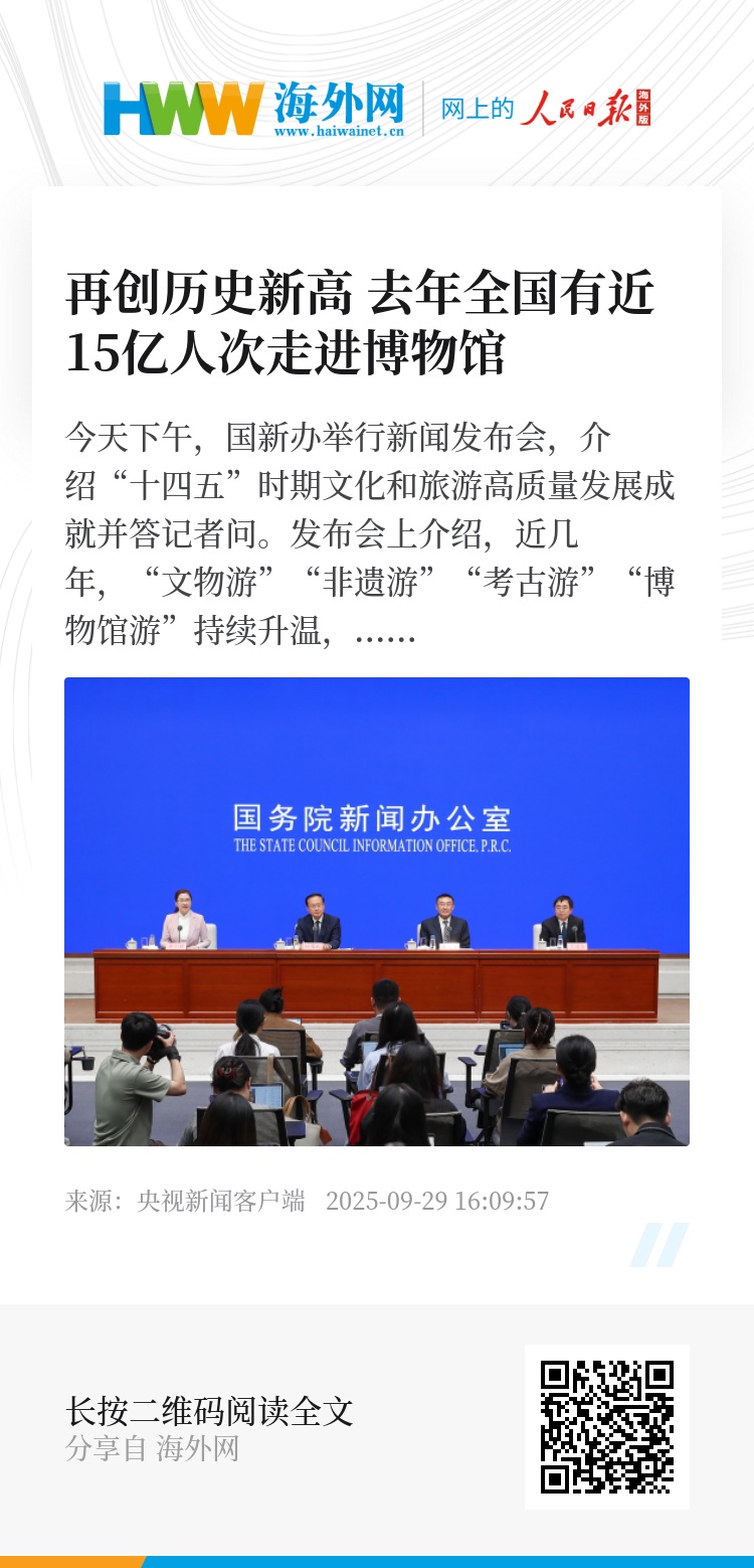 发布会上介绍,近几年,“文物游”“非遗游”“考古游”“博物馆游”持续升温,人们在旅途中,除了看山、看水、看风景之外,更希望体验美、体验文化、体验风土人情。2024年全国博物馆接待的观众接近15亿人次、再创历史新高。